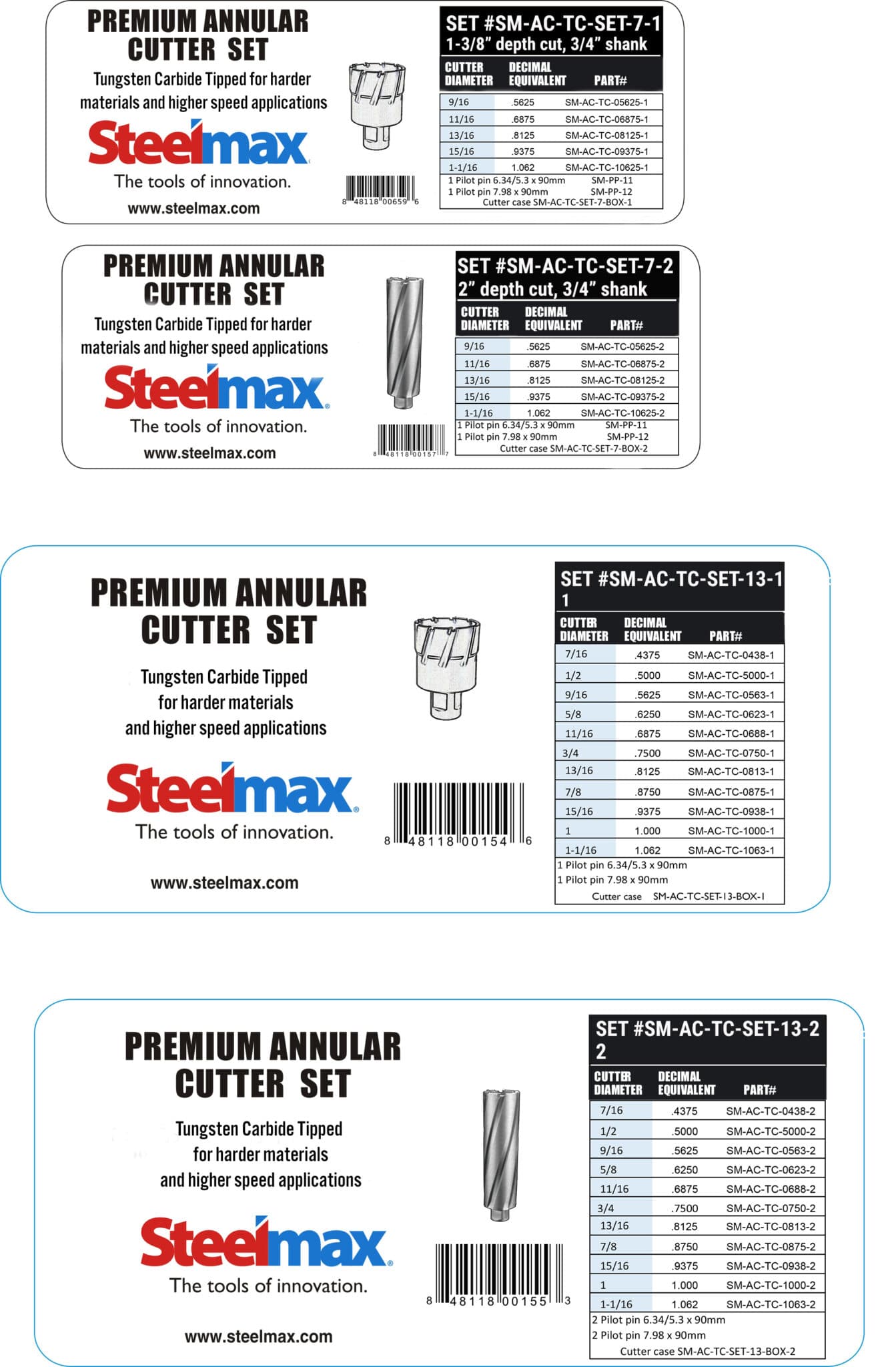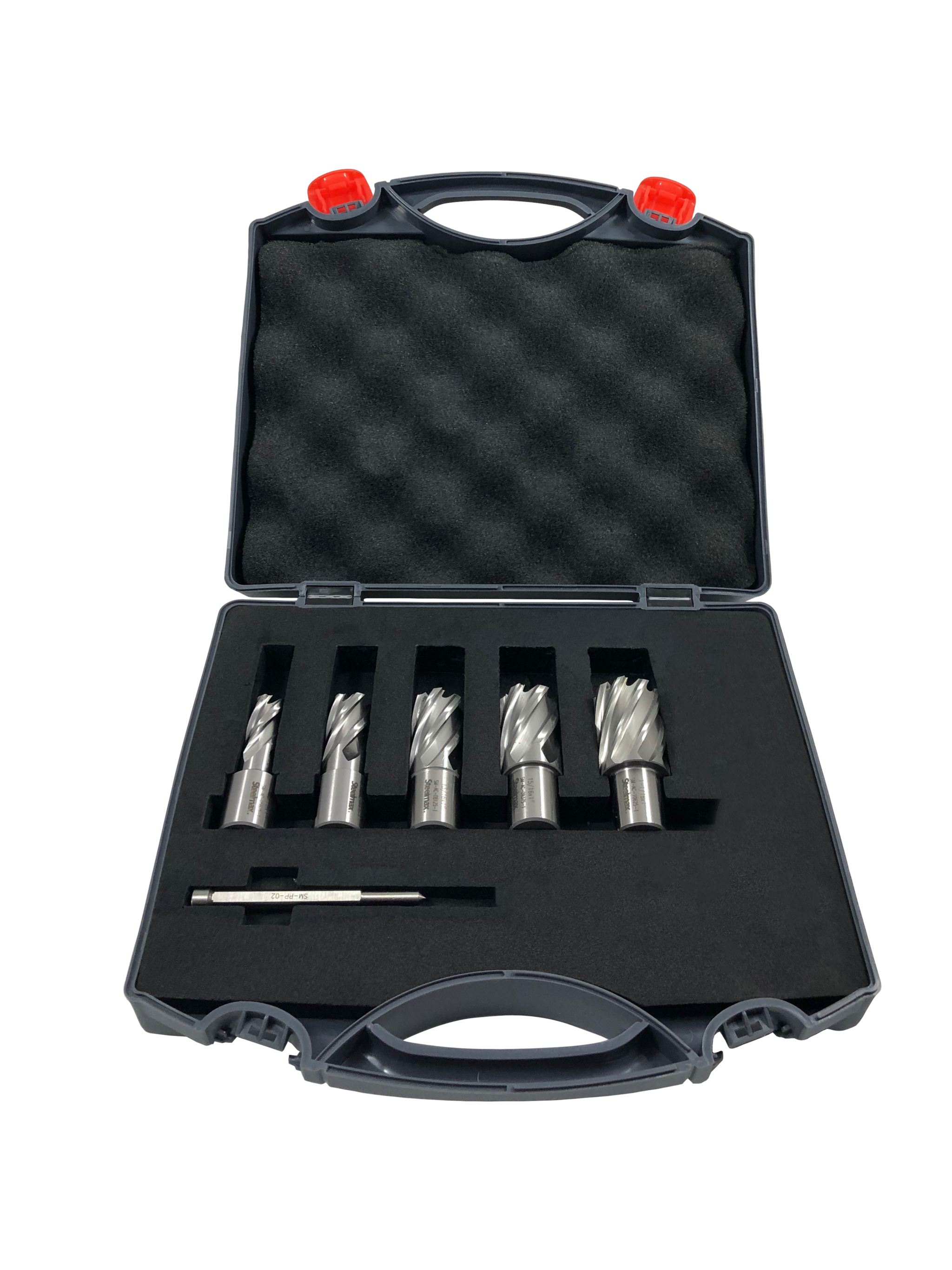 This Steelmax offering is a 13 piece or 7 piece premium annular cutter set available in 1″ & 2″ depth of cut. These annular cutter sets give you a complete system to handle the most popular hole-making jobs. Utilizing the carrying case also helps maintain the life of the annular cutters. Steelmax HSS (High Speed Steel) cutters utilize an M2Al (aluminum additive) formulation which increases cutter life due to better heat propagation characteristics and a less brittle character compared to other M2 formulations, such as those using a cobalt additive.