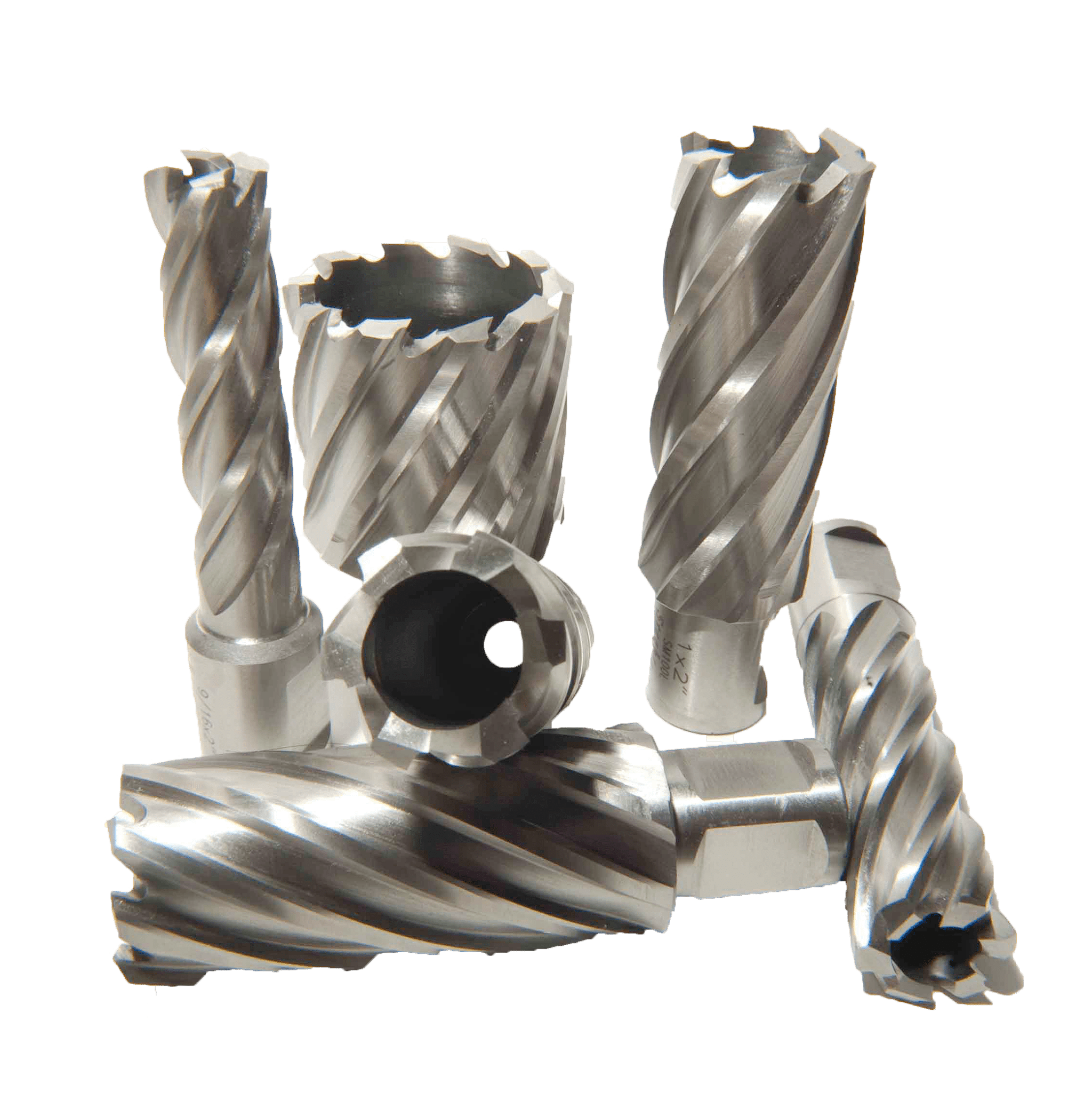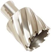 Steelmax HSS ( High Speed Steel) annular cutters utilize an M2Al (aluminum additive) formulation which increases cutter life due to better heat propagation characteristics and a less brittle character compared to other M2 formulations, such as those using a cobalt additive. HSS annular cutters are most cost-effective for mild steel applications and holes up to 2-3/8″ in diameter in material up to 2″ thick. HSS annular cutters can be re-sharpened to extend cutter life.